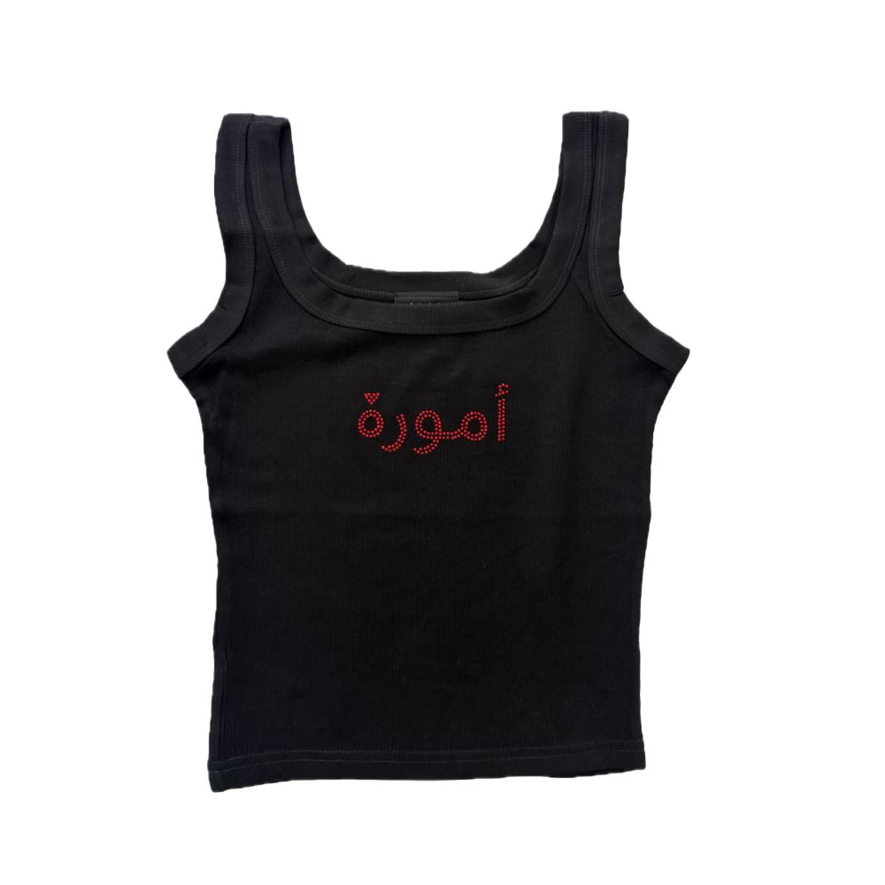 The "Amoura" tank top is a bold staple with a touch of sparkle. Featuring "أمورة" in red rhinestones—Arabic for “cutie” or “sweetheart”—this fitted black ribbed tank blends confidence, culture, and charm in one easy piece.